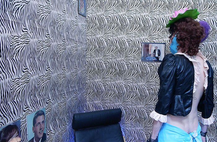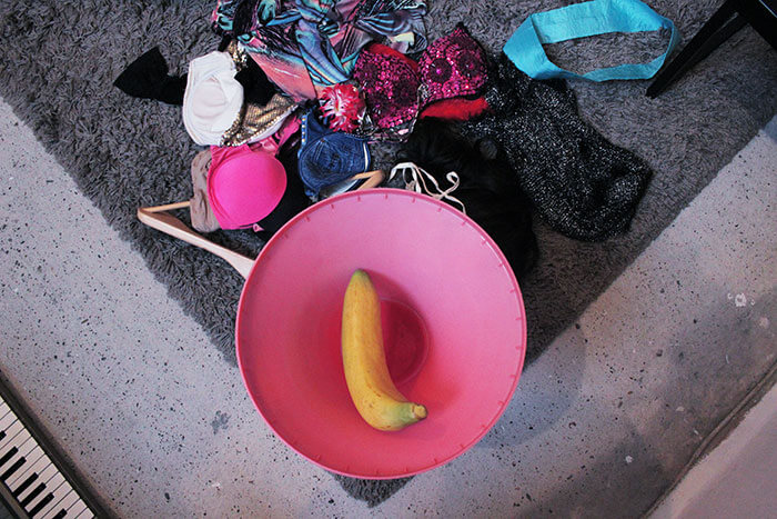 What I feel is that except for the jellyfish, with his ‘free floating’, you always feel very strong decisions. This is the outcome of this decision and this is the outcome of that. And maybe that is where the jellyfish comes in; this ‘not knowing where I’m going’ subject. And besides that you have all these very conscious surroundings where everybody decided what to do. Even the woman is also very clear posed, and the room as well. All strategic and very conscious and the text is the same, we decide this but leave it open as well to control it again in the end by deciding where to put what.